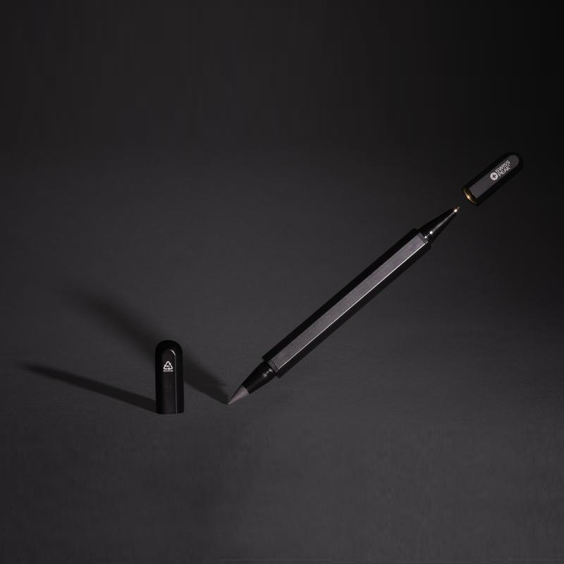 Experience superior writing with this exceptional dual-tip pen made from RCS certified recycled aluminum. It combines style and low impact with 83% recycled RCS recycled certified aluminum content. The pen boasts two tips – a graphite pencil tip on one side and a ballpen on the other side, ensuring smooth and precise writing with blue ink. Writing width 1mm, writing length 1200 metres. Its unique design breathes sophistication. Packaged in an FSC® mix black Swiss Peak gift box.
